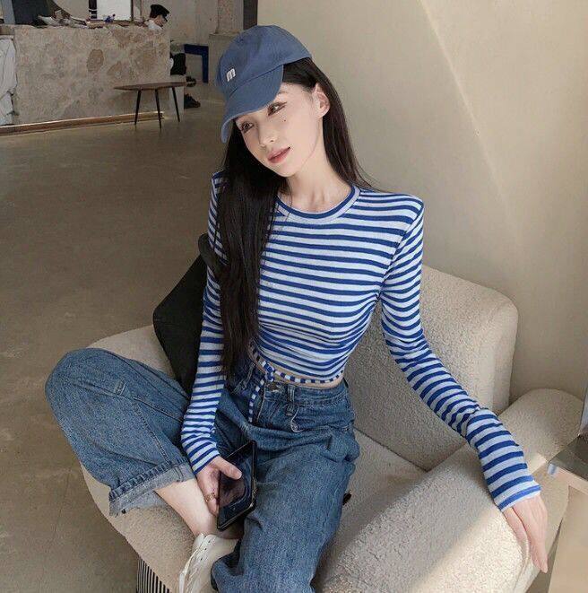 条纹T恤长袖彩色凹凸短款上衣